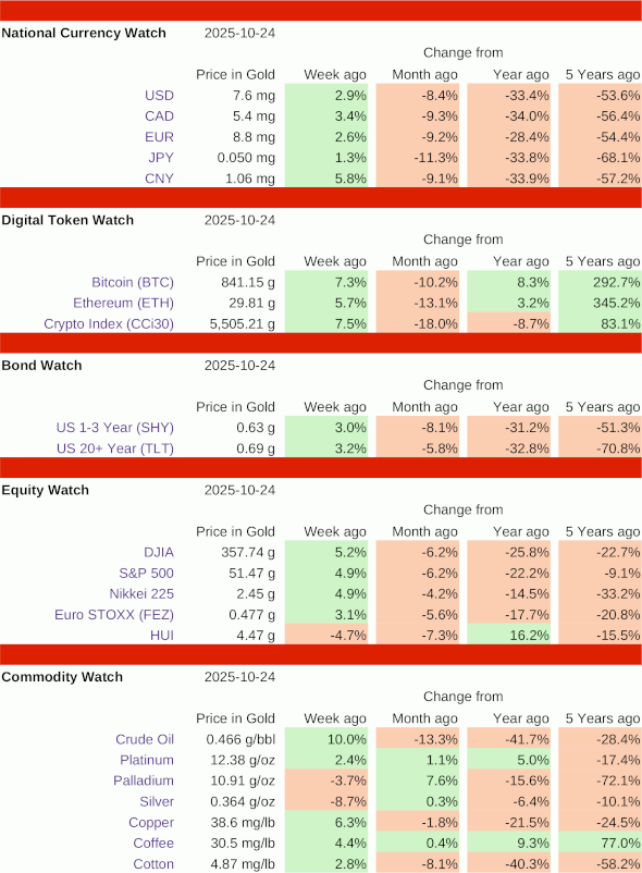 This week, markets reversed course, putting most assets in the green. The only decliners were silver, down 8.7%, gold stocks, down 4.7%, and palladium, down 3.7%. The largest gains were in crude oil, up 10.0%, the CCi30 crypto index, up 7.5%, and Bitcoin, up 7.3%. The US Dollar hit a new all-time low of 7.24 mg on Monday, then rallied to end the week up 2.9%. All other major currencies followed a similar trajectory, with the CNY rising the most, closing up 5.8%. Bonds outperformed USD cash; long term treasuries rose 3.2%.