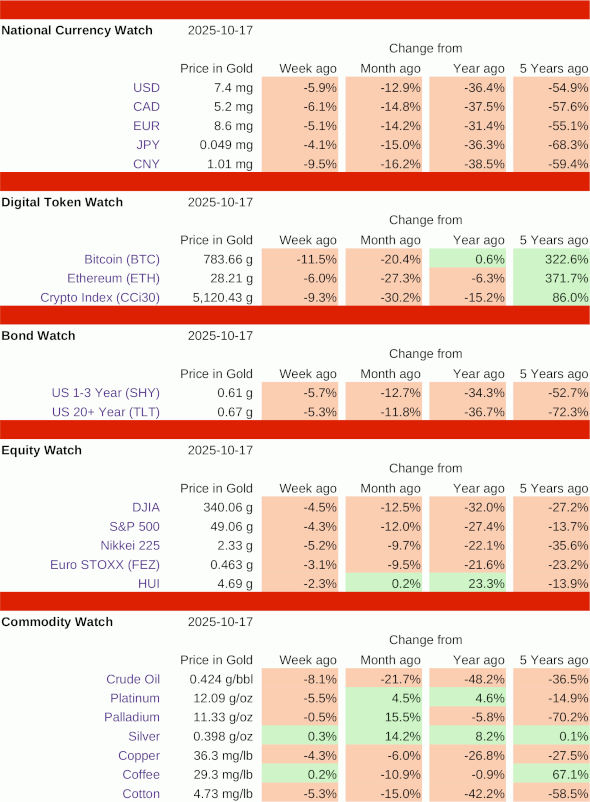 Once again, commodities were mixed, but all other asset classes were in the red. The week's best performers (and only gainers) were silver, up 0.3%, and coffee, up 0.2%. The largest losses were in Bitcoin, down 11.5%, the Chinese Yuan down 9.5%, and the CCi30 crypto index, down 9.3%. The US Dollar hit a new all-time low of 7.3 mg on Thursday, then bounced to end the week down 5.9%. All other major currencies also made new all-time lows, with the CNY hit especially hard.
