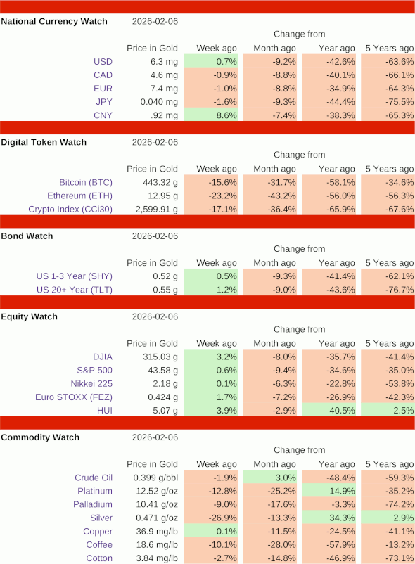 The US Dollar rose 0.7%, while short term treasuries gained 0.5% and long term bonds closed up 1.2%. This week, the Dow and the S&P 500 both hit new all-time highs when priced in US Dollars, but are down about 75% from their all-time highs against gold.
