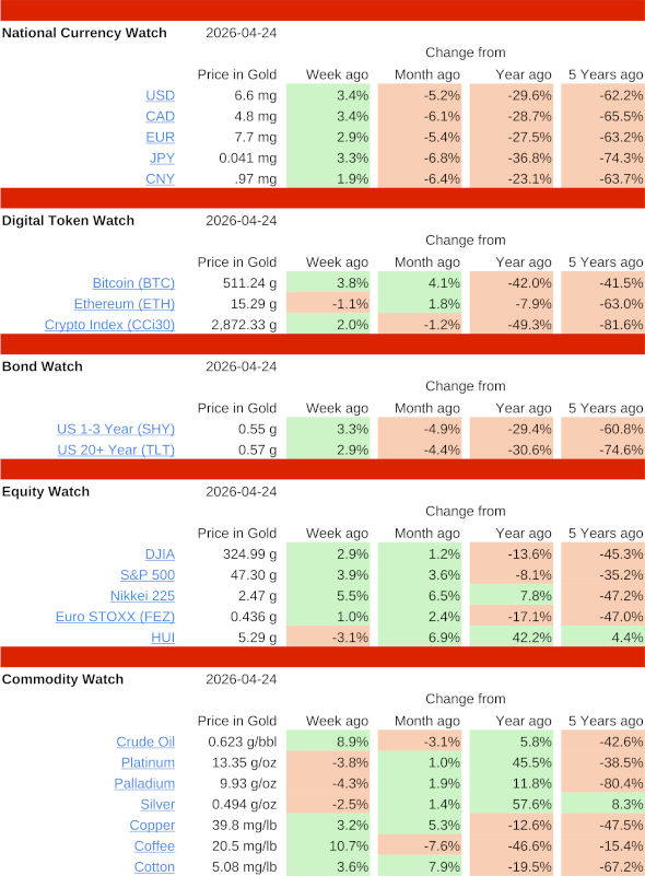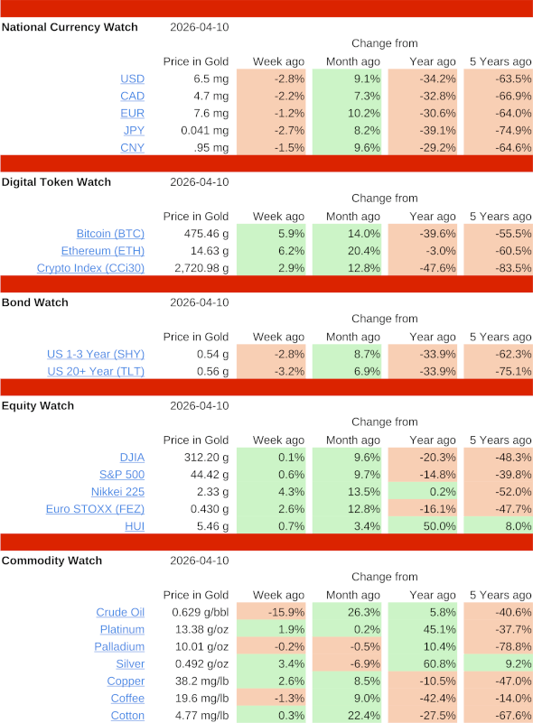 National currencies and bonds fell, cryptos and stocks rose, and commodities were mixed. The largest gains were in Ethereum, up 6.2%, Bitcoin, up 5.9%, and Japanese stocks, up 4.3%. The largest losses were in crude oil, down 15.9%, long term treasuries, down 3.2%, and the US Dollar cash and short term treasuries, down 2.8%.